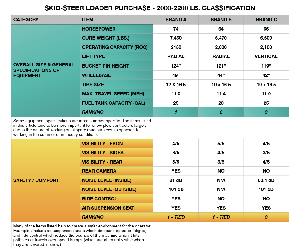 Our spreadsheet kept us on topic and allowed us to control the conversation. Good salespeople are happy to showcase their product’s strengths; however, those strengths may have very little bearing in the snow and ice management world. Coming prepared allowed us to ask the right questions and identify not only the strengths of each piece of equipment but also their weaknesses.